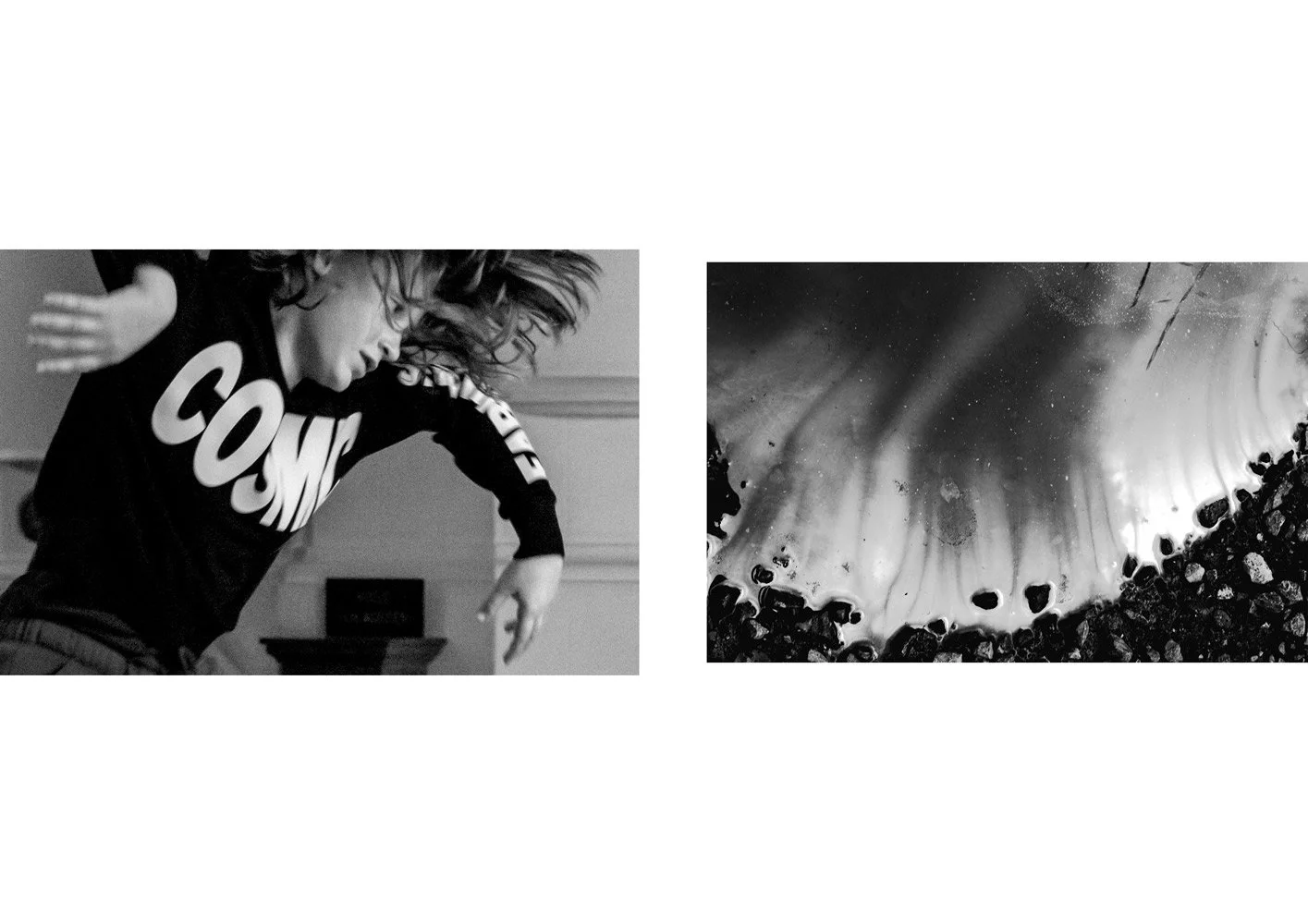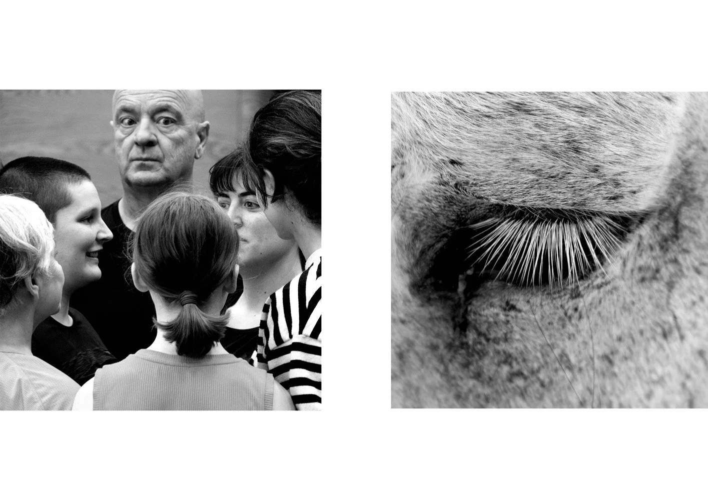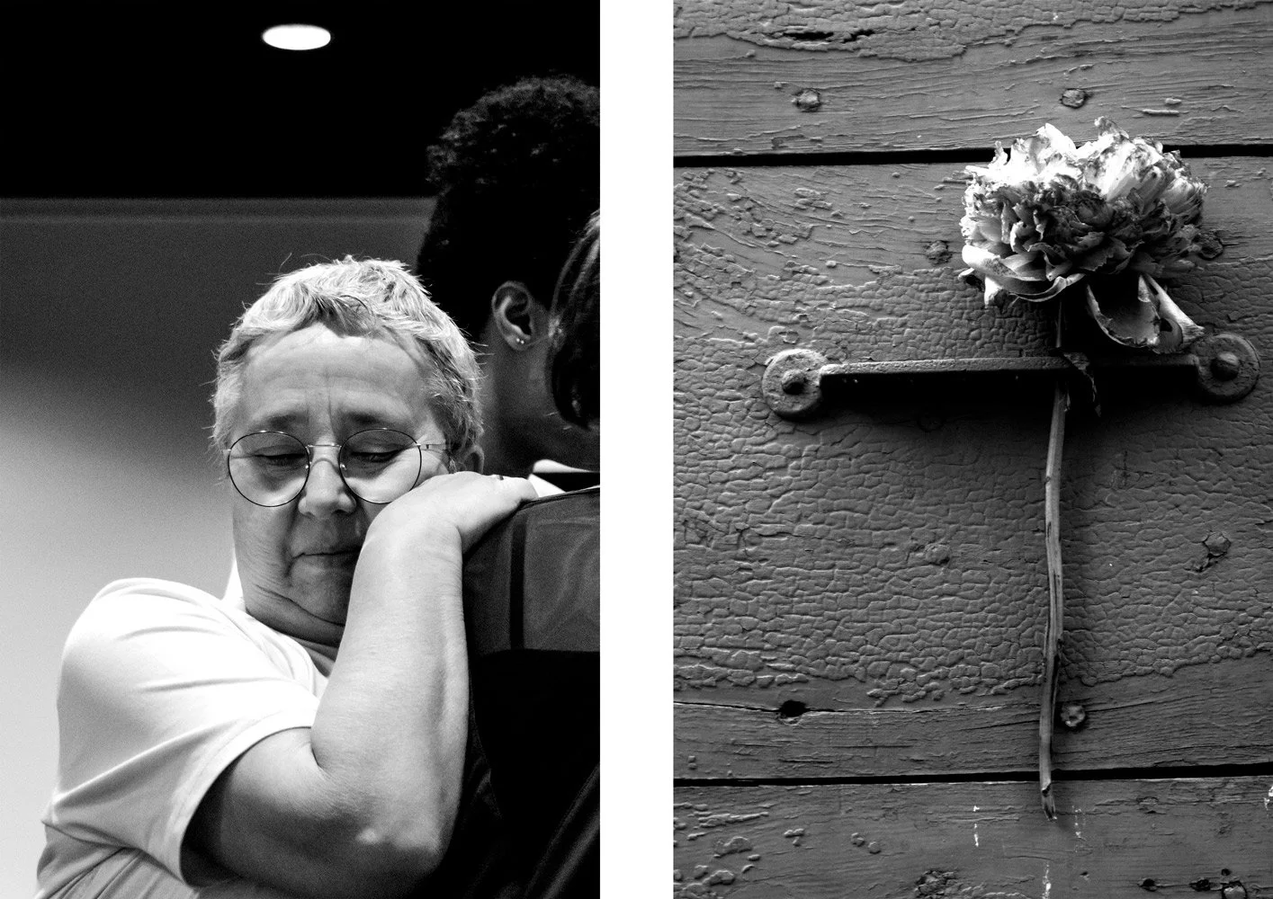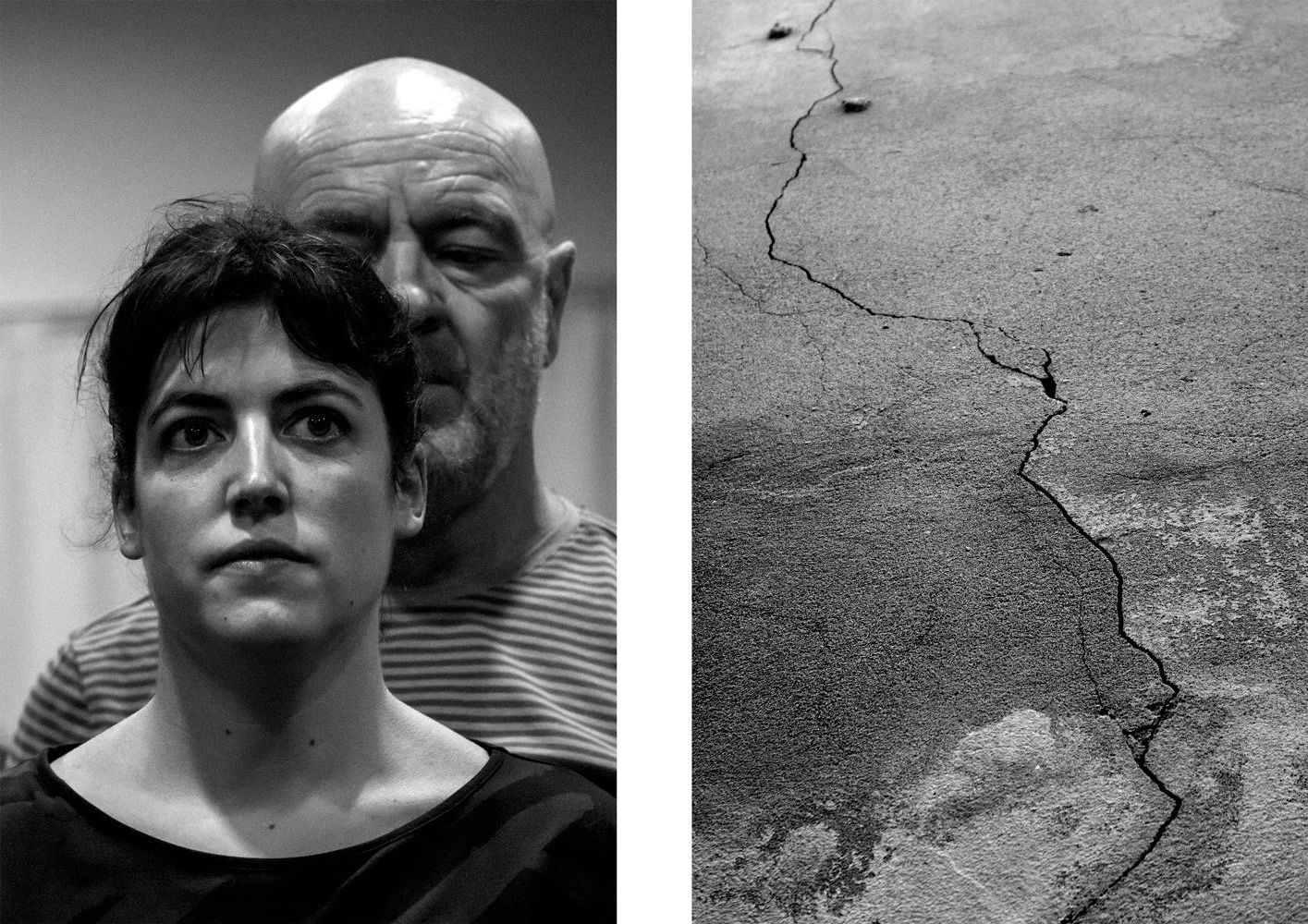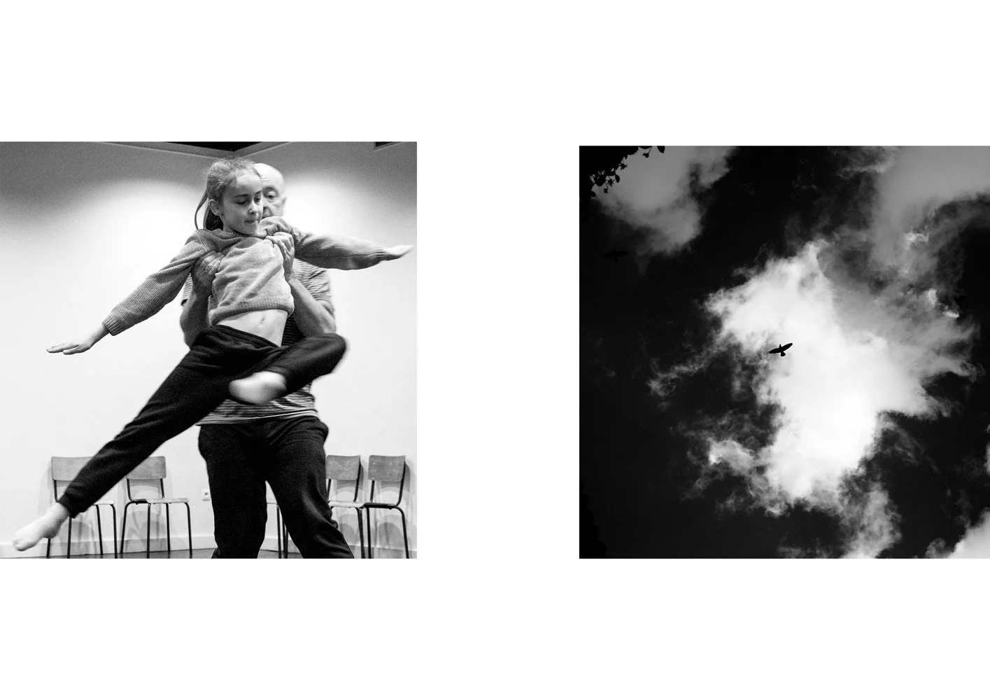 Dansant depuis de nombreuses années, j'ai eu envie de découvrir comment avec un appareil photo, je pouvais garder une trace artistique de cet art que je connais. J'ai eu la chance de rencontrer Koen De Preter, chorégraphe et performer anversois qui m'a permis de photographier six journées de répétition de son spectacle : "Adagiae". Le projet a été réalisé avec dix danseurs et danseuses de 13 à 70 ans auquel s'est joint un musicien professionnel. Il a été présenté dans diverses églises de la province d'Anvers. De cette expérience, je suis revenue avec une série de photos et des questions aussi sur la photographie et la danse : "Comment capturer le mouvement ?", Comment rendre visible la mobilité dans l'immobilité ?, "Quelles sont les différences entre une photo de danse utilisée pour la promotion d'un spectacle ou pour faire plaisir aux interprètes avec celles utilisées dans un travail artistique ?", "Qu'est-ce qui capte mon regard quand je photographie la danse ?" et enfin, "Que m'évoquent ces photos quand je les regarde hors de leur contexte ?" et "Comment puis-je écrire un nouveau récit à partir d'elles ?" Pour répondre à cette dernière question, je me suis imprégnée des émotions et/ou du graphisme que dégagent pour moi les photos qui ont retenu mon attention. Je suis ensuite partie glaner principalement dans le sud de la France, des échos poétiques propres à certaines d'entre elles. M'éloignant du propos du chorégraphe, j'ai ensuite cherché un fil conducteur entre ces duos de photos pour tisser une nouvelle histoire
